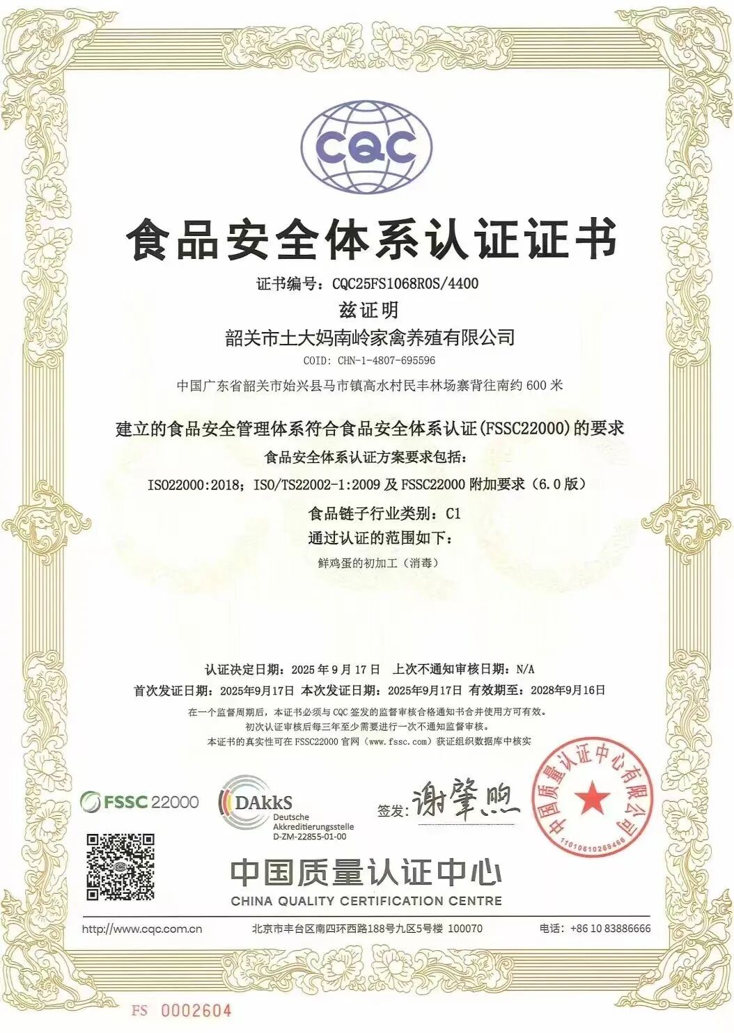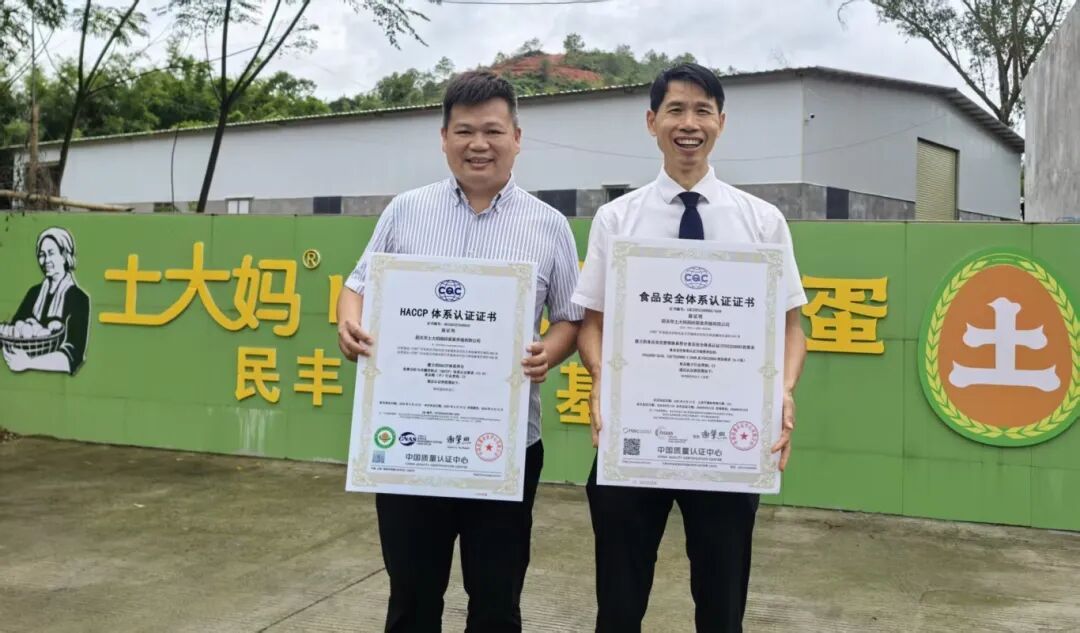 中国质量认证中心审核老师黄华东说,通过8月份和9月份对土大妈进行了严格的质量评审,土大妈最终在9月份获得了FSSC22000和HACCP管理体系认证,它也是我们国内首家山林散养非笼养鸡蛋企业获得国际双认证的一个企业,这个FSSC22000也是我们国际通行的一个认证的标准,它获得了雀巢、山姆、沃尔玛等大企业的认可。